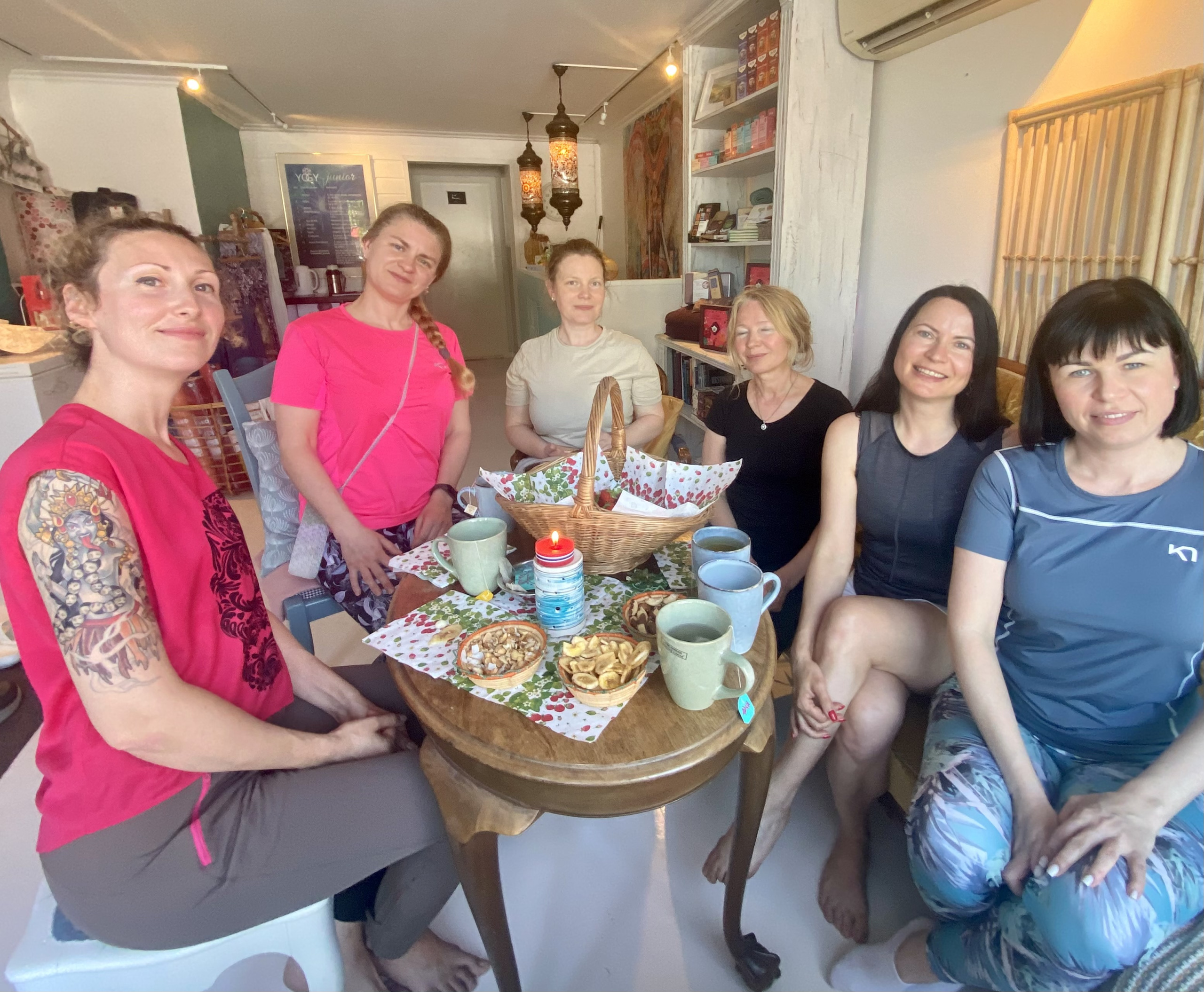 Yoga/avspenning, kvinnefellesskap og gjensidig støtte.